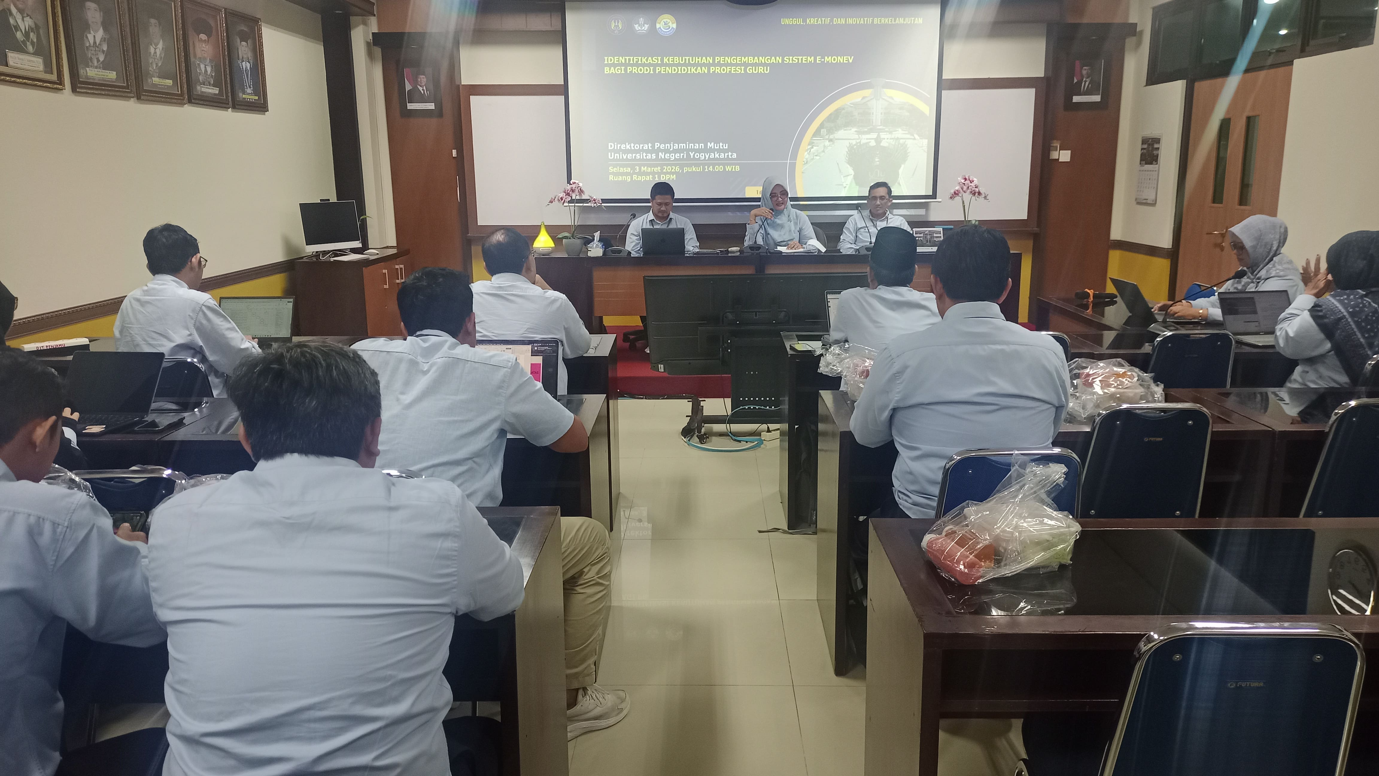Yogyakarta – Direktorat Penjaminan Mutu (DPM) Universitas Negeri Yogyakarta (UNY) menggelar rapat penting bertajuk "Identifikasi Kebutuhan Pengembangan Sistem E-Monev bagi Prodi Pendidikan Profesi Guru (PPG)" pada Selasa, 3 Maret 2026. Bertempat di Ruang Rapat 1 Direktorat Penjaminan Mutu, kegiatan yang dimulai pukul 14.00 WIB ini bertujuan untuk merumuskan kebutuhan sistem monitoring dan evaluasi (monev) digital yang sesuai dengan karakteristik unik Program Studi PPG.
