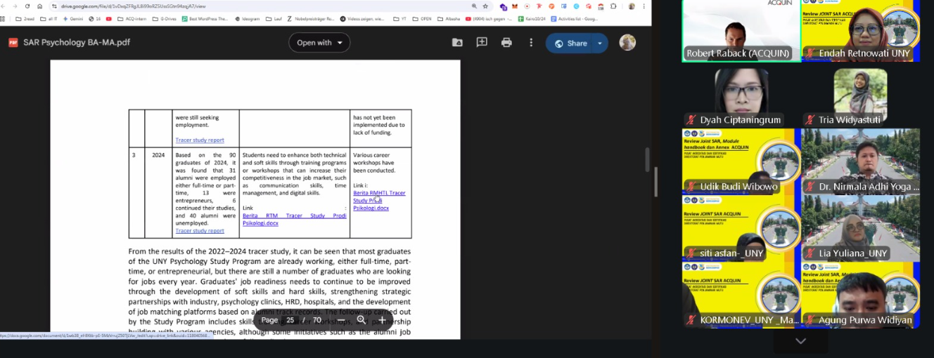 Direktorat Penjaminan Mutu Universitas Negeri Yogyakarta (UNY) melaksanakan kegiatan Akreditasi Internasional: Review Joint SAR, Module Handbook, dan Annex ACQUIN pada Jumat, 10 Oktober 2025, pukul 15.00 WIB melalui Zoom Meeting. Kegiatan ini menghadirkan narasumber dari lembaga akreditasi internasional ACQUIN, yaitu Mr. Robert Raback, yang berperan sebagai Project Manager dalam proses pendampingan akreditasi UNY.